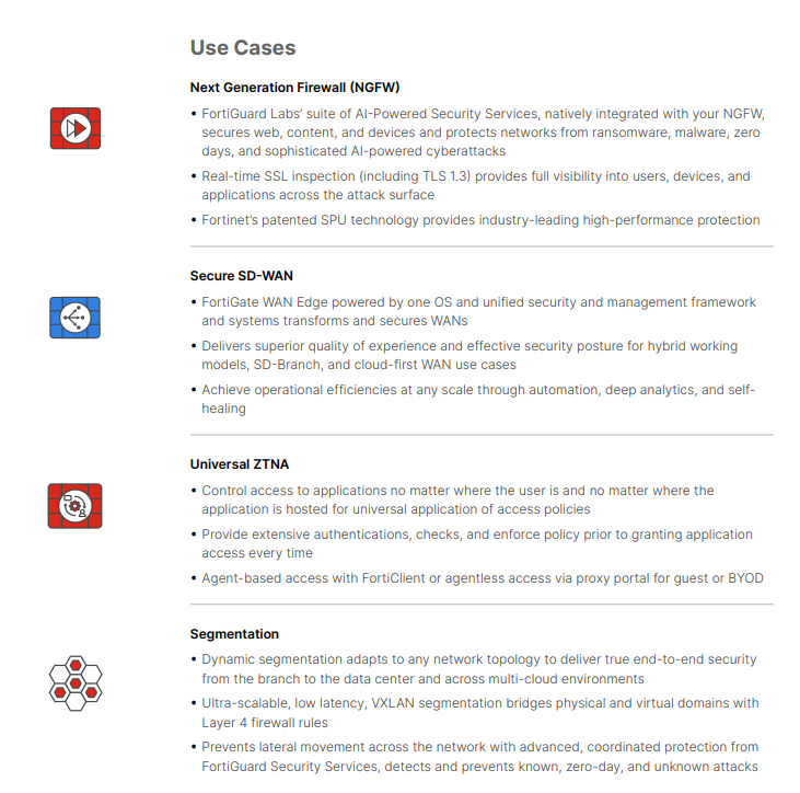- Secure SD-WAN: Integrates SD-WAN capabilities to optimize application performance and reduce WAN costs.
